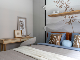 Спальня выполнена в неоклассическом стиле, нейтральная бежевая цветовая гамма в сочетании с темно-синей кроватью. Напротив кровати висит телевизор, который можно смотреть как лежа на кровати, так и сидя на банкетке перед кроватью. Я использовала золотые
