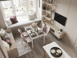 Сочный светлый интерьер, созданный для южного побережья под сдачу. Задача: на небольшой площади разместить 2 полноценных спальных места, большой обеденный стол, функциональную кухню со всей необходимой техникой. Преимущественно использовались холодные